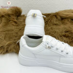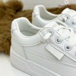 Craquez pour le style épuré et sophistiqué de ces sneakers blanches à plateforme. Confectionnées en cuir synthétique texturé de haute qualité, elles sont agrémentées de détails raffinés tels que des œillets métalliques argentés et des embouts de lacets ornés de strass pour une touche de glamour subtile.